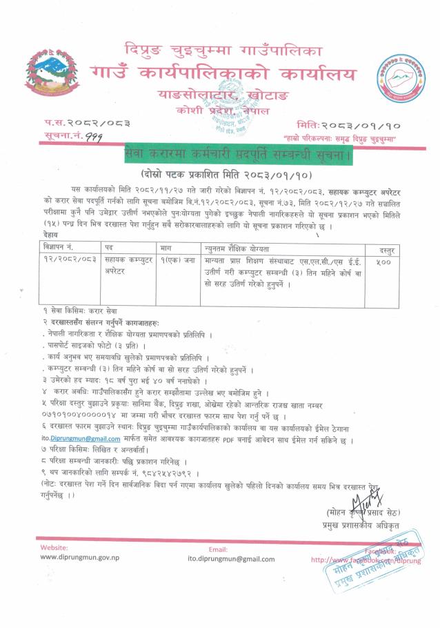 सेवा करारमा कर्मचरी पदपूर्ति सम्बन्धी सूचना !!!(कम्प्युटर अपरेटर)