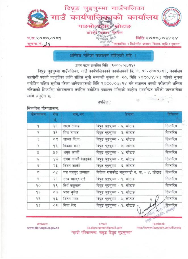 कार्यालय सहयोगी पदको अन्तिम नतिजा प्रकाशन सम्बन्धी सूचना ।।।