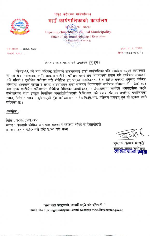 पि.सि.आर परिक्षणको लागि स्वाव प्रदान गर्न उपस्थित हुनु हुन ।