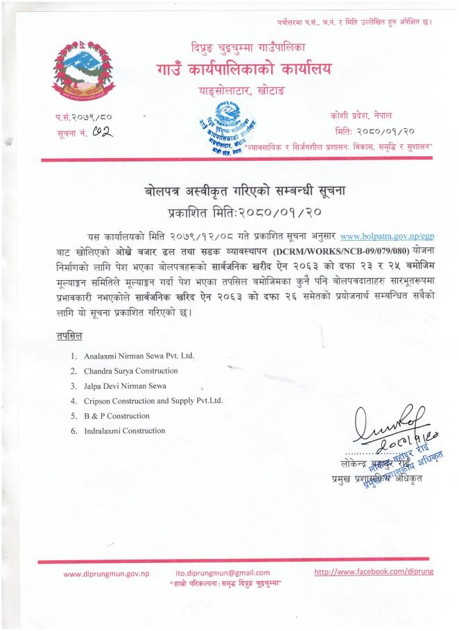बोलपत्र अस्वीकृत गरिएको सम्बन्धि सूचना। प्रकाशित मितिः २०८०।०१।२० गते (बुधबार)