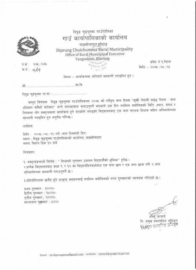 यही मिति २०७५ /०५ /२९ गते राष्ट्रिय बाल दिवसको अबसरमा दिप्रुङ चुइचुम्मा गाउँपालिकामा "शिक्षा को गुणस्तर उकास्न विद्यार्थी को भूमिका" भन्ने शिर्षकमा वक्तृत्व कला हुने भएकोले सहभागी भइ दिन अनुरोध छ ।