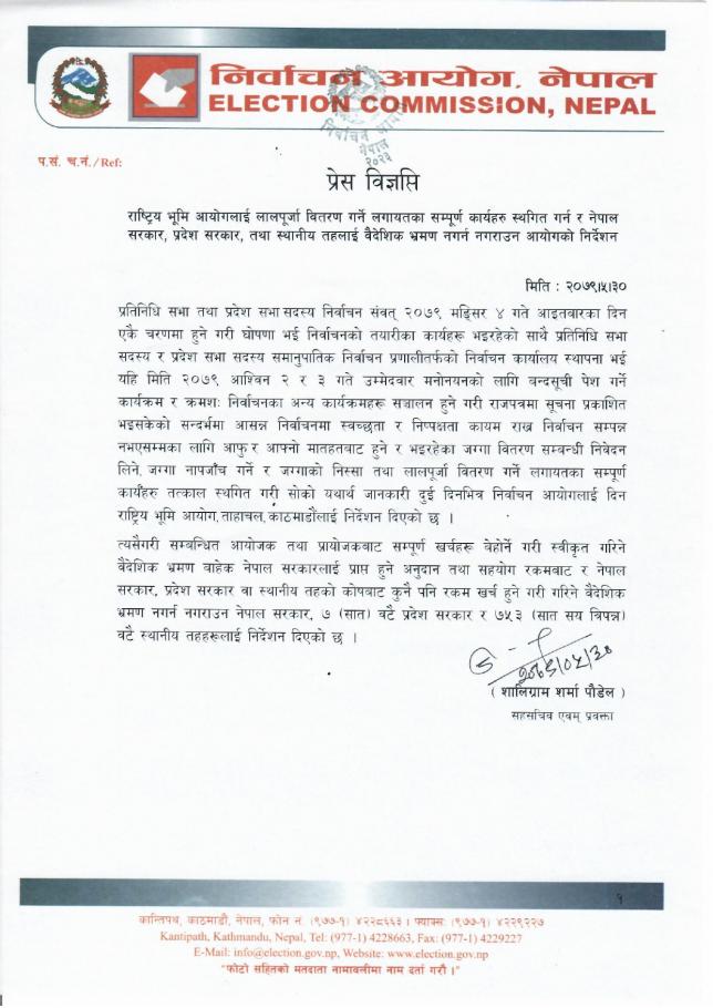 राष्ट्रिय भूमि आयोगलाई लालपूर्जा वितरण गर्ने लगायतका सम्पूर्ण कार्यहरु स्थगित गर्न र स्थानीय तहलाई वैदेशिक भ्रमण नगर्न नगराउन आयोगको निर्देशन