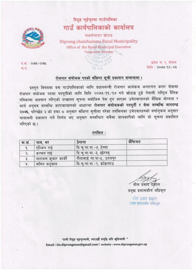 रोजगार संयोजक पदको संक्षिप्त सूची वर्णानुक्रम (Alphabetical Order) अनुसार प्रकाशन गरिएको सूचना ।