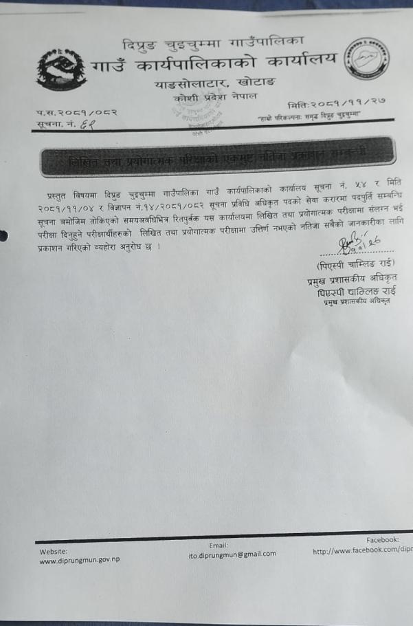 लिखित तथा प्रयोगात्मक परिक्षाको एकमुष्ट नतिजा प्रकासशन सम्बन्धमा !!