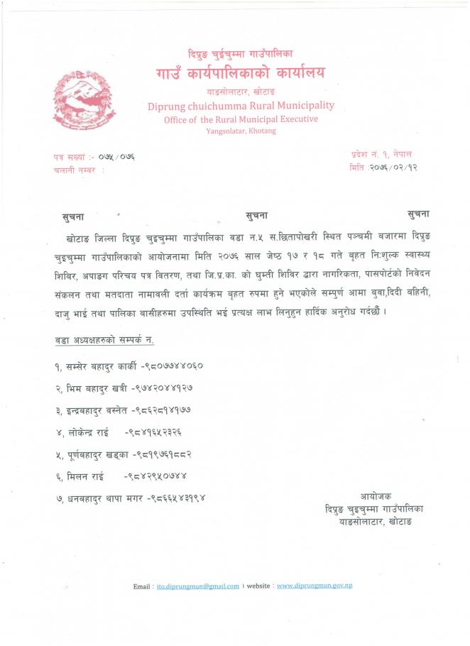 खोटाङ जिल्ला दिप्रुङ चुइचुम्मा गाउँपालिका वडा नं. ५ स.छितापोखरीस्थित पंचमी बजारमा दिप्रुङ चुइचुम्मा गाउँपालिकाको आयोजनामा मिति २०७६ साल जेष्ठ १७ र १८ गते बृहत नि:शुल्क स्वास्थ्य शिविर( गाइनो, बालरोग, दाँत, फिजिसियन, आँखा र हाडजोर्नी तथा नसा) ,अपाङ्ग परिचय पत्र वितरण तथा जिल्ला प्रशासन कार्यालयको घुम्ती शिविरद्वारा नागरिकता प्रमाणपत्र वितरण र निर्वाचन कार्यालयबाट मतदाता नामावली दर्ता कार्यक्रम बृहत रुपमा हुने भएकोले सम्पूर्ण आमा वुवा,दिदी बहिनी,दाजु भाई तथा पालिका बासीहरूमा उपस्थित भइ प्रत्यक्ष लाभ लिनुहुन हार्दिक अनुरोध गर्दछौ |