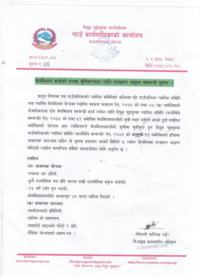 सूचना।।। विषयः मेलमिलाप कर्ताको रुपमा सूचिकरणका लागि दरखास्त आह्वान सम्बन्धि सूचना।