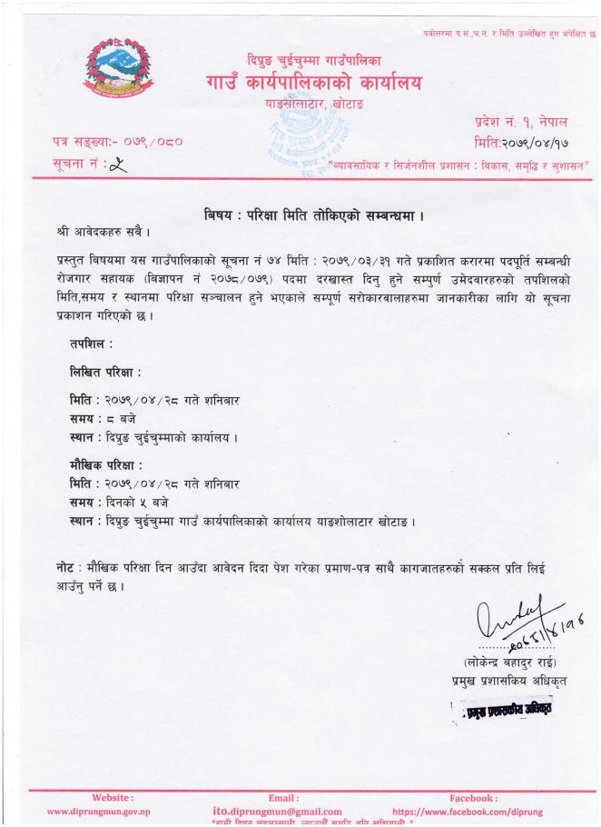 स्थानीय रोजगार सेवा केन्द्रको लागि सहायक रोजगार पदपूर्तिको लागि परिक्षा मिति तोकिएको सूचना