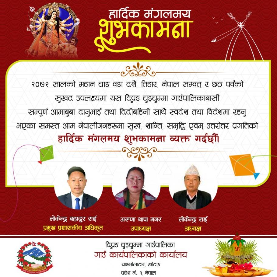 २०७९ सालको महान चाड वडा दशै, तिहार,नेपाल सम्वत् र छठ पर्वको शुभकामना।