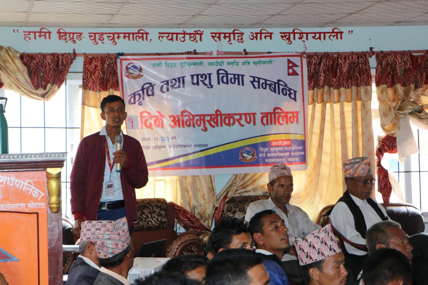 आज मिति २०७९/०३/२० गतेकाे दिन यस दिप्रुङ चुइचुम्मा गाउँपालिकाकाे अध्यक्ष श्री लाेकेन्द्र राई ज्यूकाे अध्यक्षता साथै गाउँपालिका उपाध्यक्ष ज्यू, प्रमुख प्रशासकीय अधिकृत ज्यू लगायत सम्पुर्ण कर्मठ कृषकहरुकाे उपस्थितिमा सहजकर्ता श्री बाबुराम बराल ज्यूद्धारा कृषि तथा पशु एक दिने अभिमुखीकरण तालिम सम्पन्न गरियाे ।