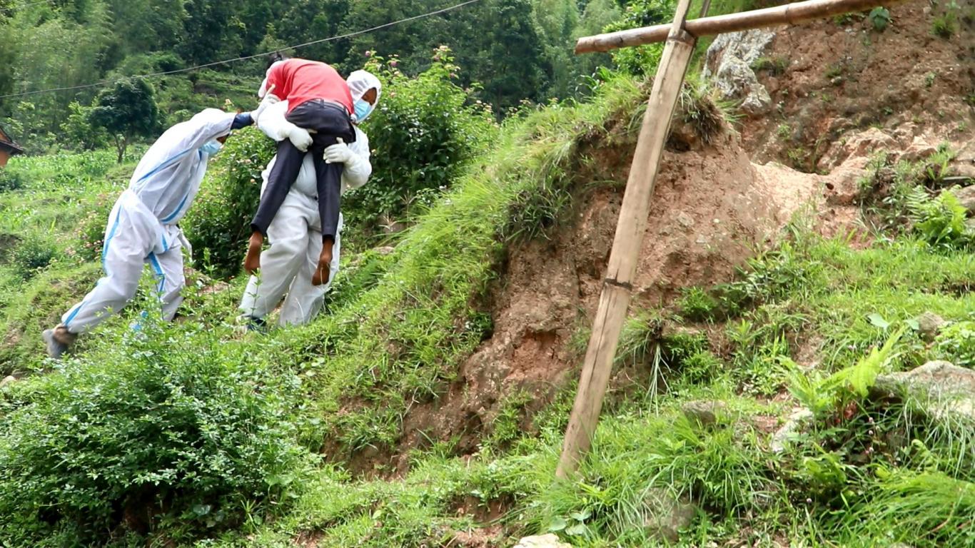 करिब ५०० मिटर पिठ्यूँमा बोकी कोभिड संक्रमितलाई अस्पताल लग्नु हुँदै गा.पा. अध्यक्ष ज्यू ।