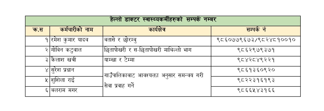 हेल्लो डाक्टर स्वास्थ्यकर्मीहरुको सम्पर्क नं