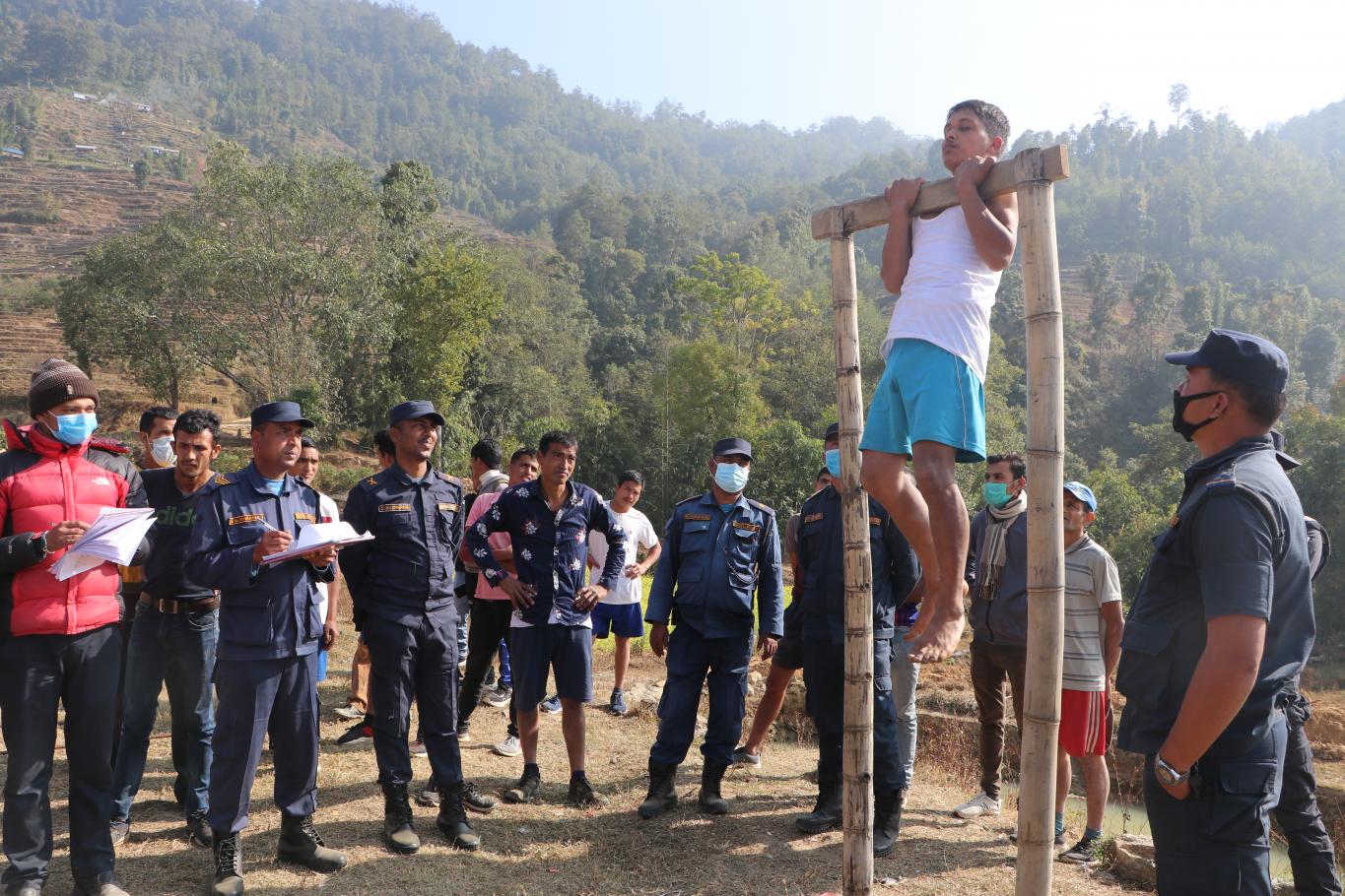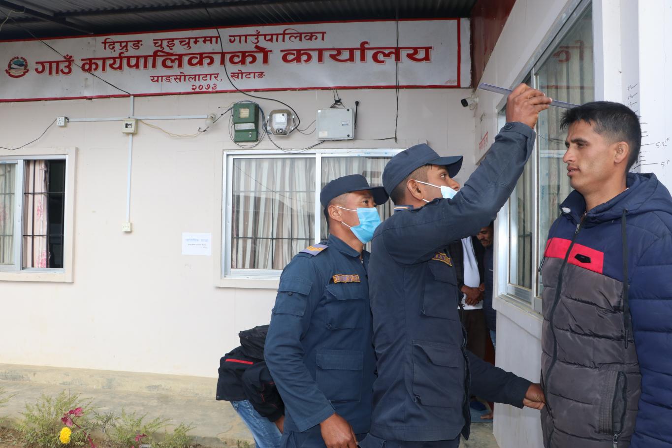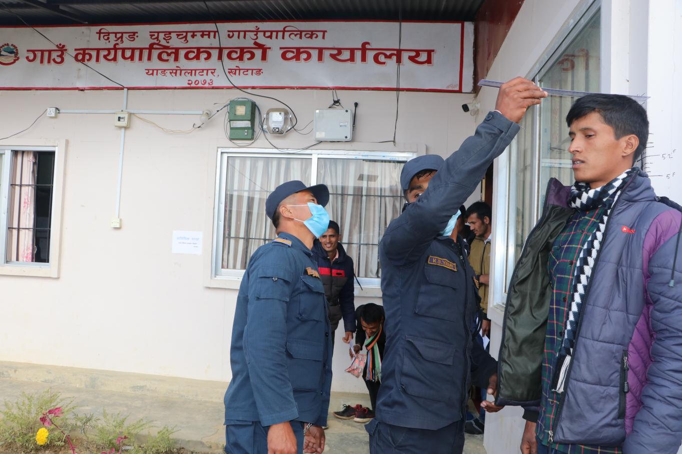 गाउँपालिका प्रहरी(हवल्दार र जवान) पदको छनौट परीक्षाको पहिलो दिन आज मिति २०७७/०९/०४ गतेका केही झलकहरू । आज उचाई, तौल, छाति, प्रेसर, तापक्रम र शारिरीक अवस्थाबारे जाँच गरिएको थियो । प्र.ह. पदमा १० जना मध्ये उपस्थित ८ जना नै दोस्रो चरणको लागि सफल भएको र प्र.ज. पदमा ४५ जना मध्ये उपस्थित २९ जनामा १ जनाको उचाई मापदण्ड अनुरूप नभएको र बाँकी २८ जना मात्र दोस्रो चरणको लागि सफल भएको जानकारी गराइन्छ ।