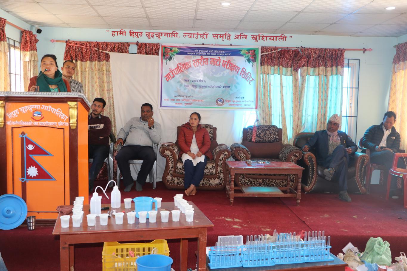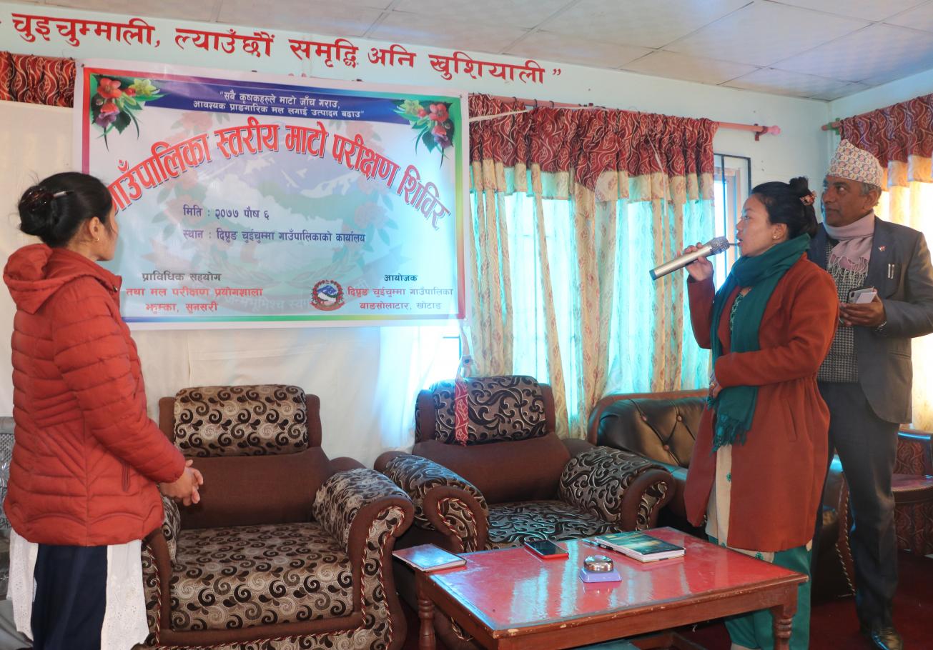 आज मिति २०७७ साल पौष ६ गते दिप्रुङ चुइचुम्मा गाउँपालिकामा संकलित ३०० वटा माटोको नमुनाको परीक्षण कार्य शुरू भएको छ । १ नं. प्रदेश माटो तथा मल परीक्षण प्रयोगशाला झुम्का सुनसरीको प्राविधिक सहयोगमा ७ वटै वडाका कृषकहरूको माटोको अम्लियपना र छारियपना सुधार गरी माटोको उर्वराशक्ति बढाउने उद्धेश्ले गाउँपालिकाले माटो परीक्षण शिविर संचालन गरेको हो । माटो परीक्षण पश्चात् माटोको प्रकृति हेरी गाउँपालिकाले आ.व. २०७७/०७८ कार्यक्रमहरू संचालन गर्ने लक्ष्य राखेको छ । उक्त कार्यक्रमको उद्घाटन यस कार्यक्रमको प्रमुख अतिथि तथा गाउँपालिका उपाध्यक्ष श्री सपना राई ज्यूले गर्नु भएको थियो ।