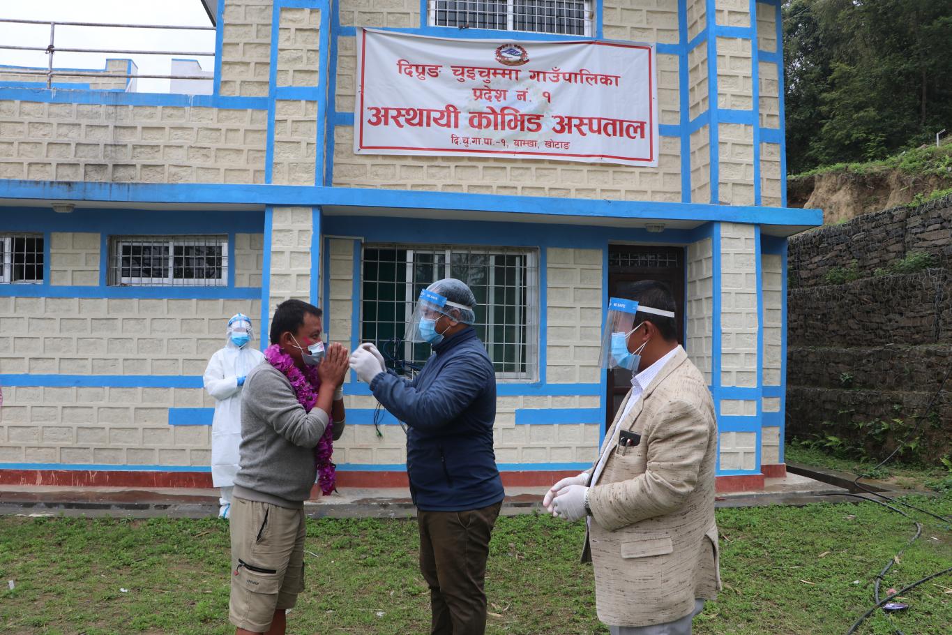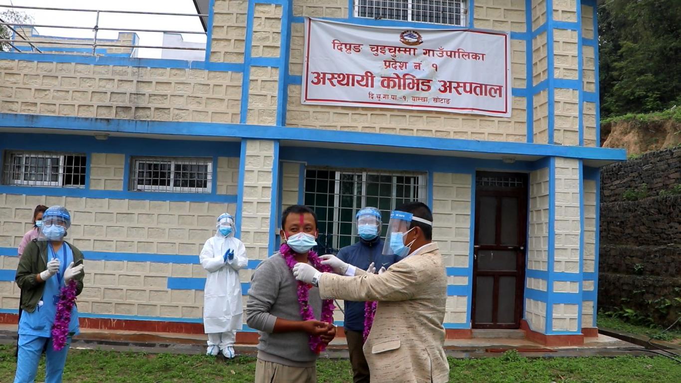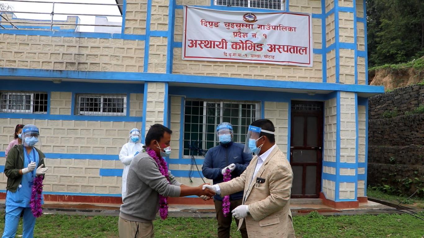 दिप्रुङ चुइचुम्मा गाउँपालिका वडा नं. १ खामडाँडाकी कोभिड-१९ संक्रमित सिकिस्त विरामी ८८ वर्षिय धन कुमारी अधिकारीलाई आफ्नो पिठ्युँमा बोकी कोभिड अस्थायी अस्पताल लानु हुँदै गाउँपालिका अध्यक्ष श्री भुपेन्द्र राई ज्यू ।